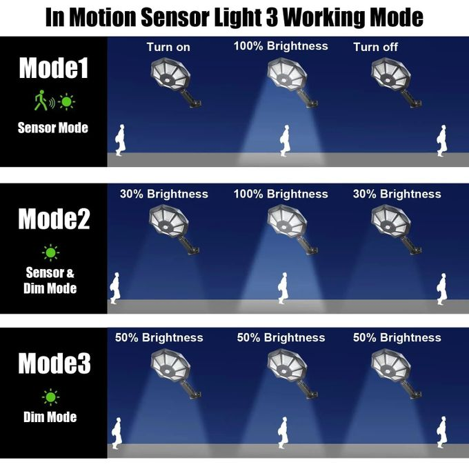 The solar outdoor light motion sensor is based on ergonomics, using human infrared sensor PIR chip as a self-service lighting control system, with strong anti-interference ability. According to the physical principle, the shape diffused light environment inside the pyramid lamp bead has a refraction efficiency as high as 98%. We are also equipped with far infrared remote control, the remote control distance is 5-10 meters.